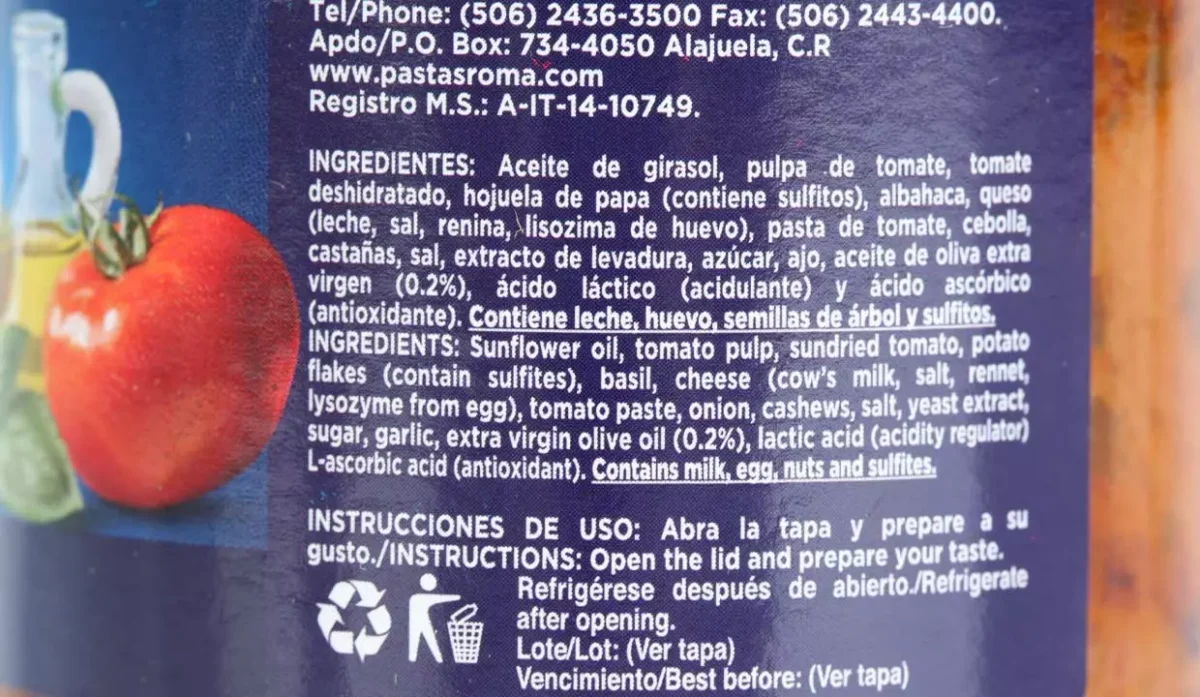 | Ingredientes | Aceite de girasol, pulpa de tomate, tomate deshidratado, hojuela de papa (contiene sulfitos), albahaca, queso, pasta de tomate, cebolla, castañas, sal, azúcar, ajo y aceite de oliva extra virgen |