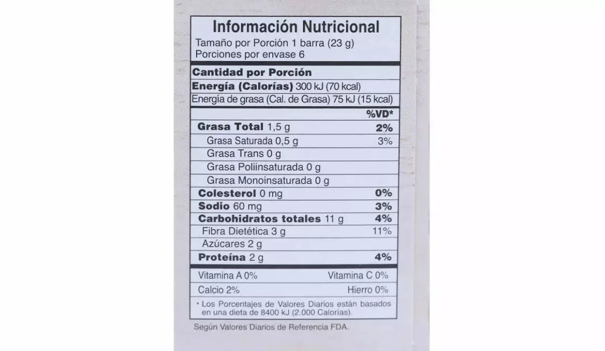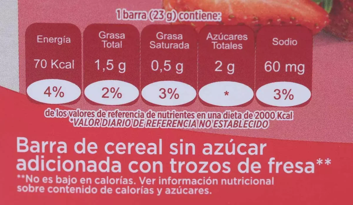 | Ingredientes | Avena en hojuela, hojuelas de maíz, sal, malta de cebada, fresa deshidratada en trozos, leche descremada en polvo, grasa vegetal, sabor natural a fresa, aceite de maíz y edulcorante natural no calórico |