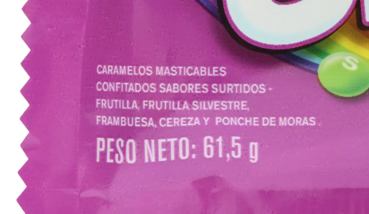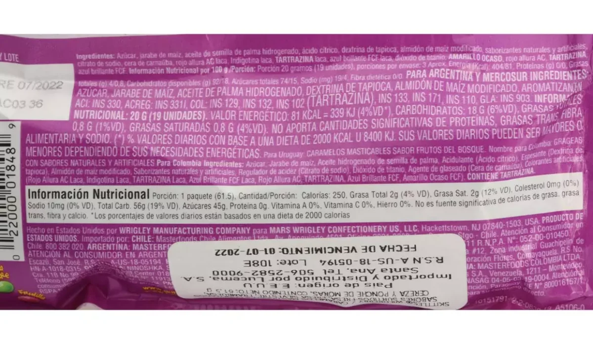 | Ingredientes | Azúcar, jarabe de maíz, aceite de semilla de palma, ácido cítrico, almidón modificado de maíz, saborizantes naturales y artificiales a fresa, fresa silvestre, frambuesa, cereza y ponche de moras |