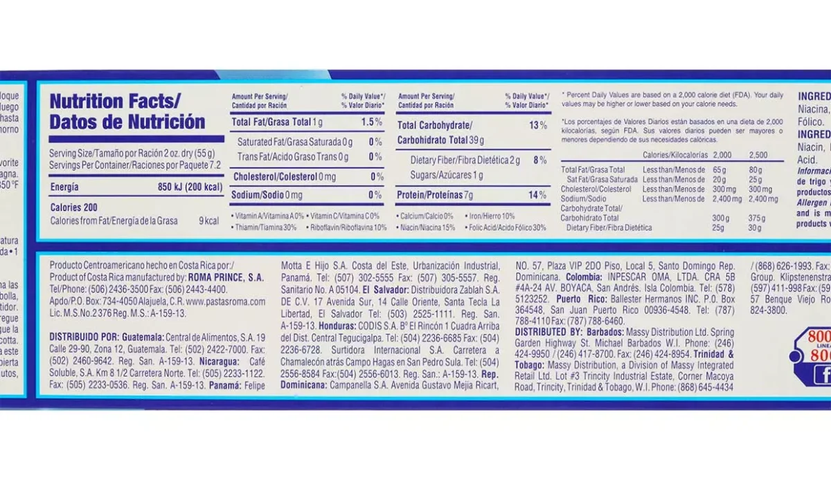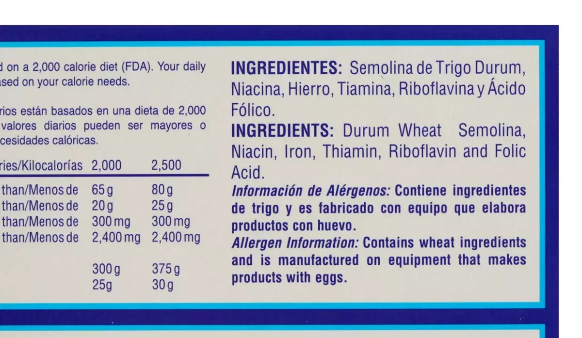 | Ingredientes | Semolina de trigo durum, niacina, hierro, tiamina, rivoflavina y ácido fólico |