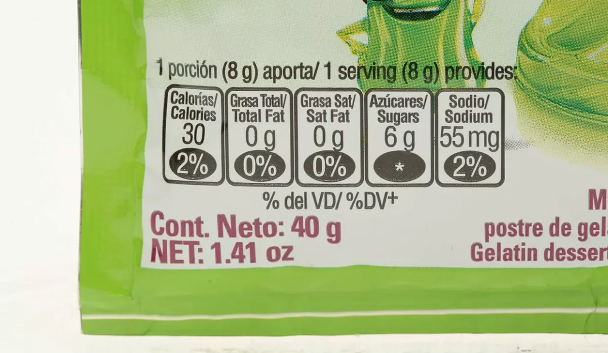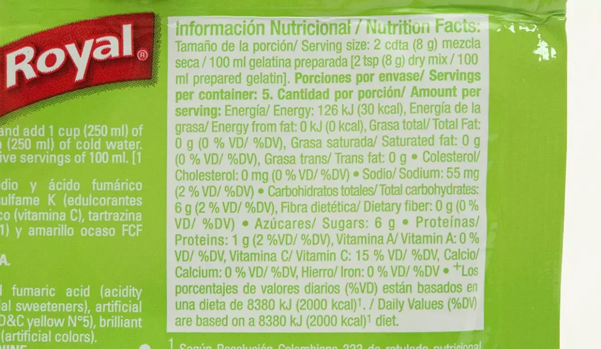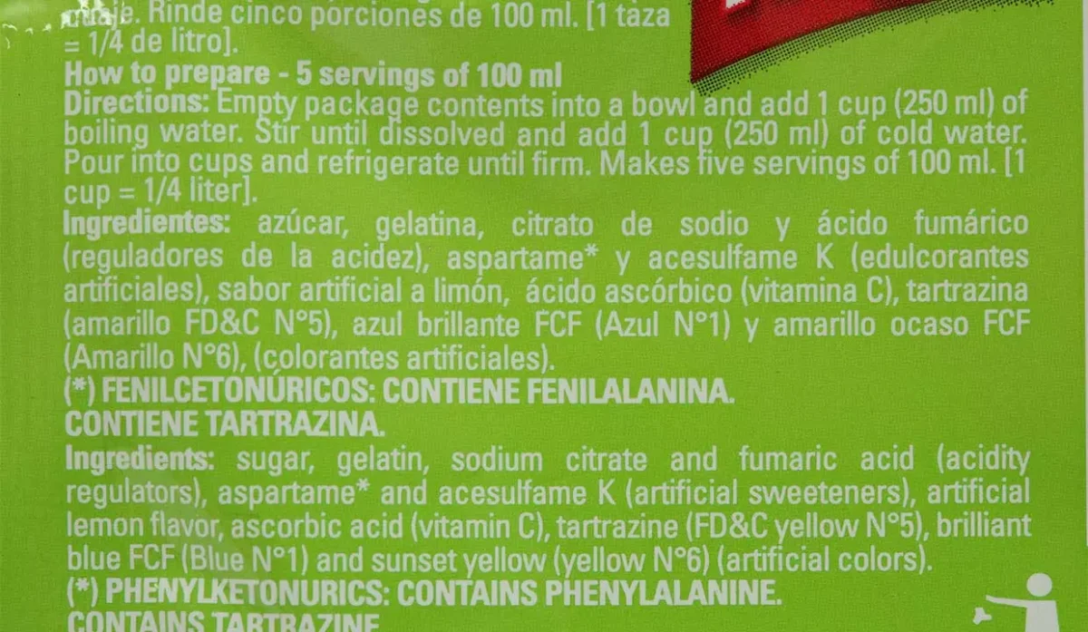 | Ingredientes | Azúcar, gelatina, citrato de sodio, ácido fumárico, aspartame, colorantes artificiales, tartrazina y sabor artificial a limón |