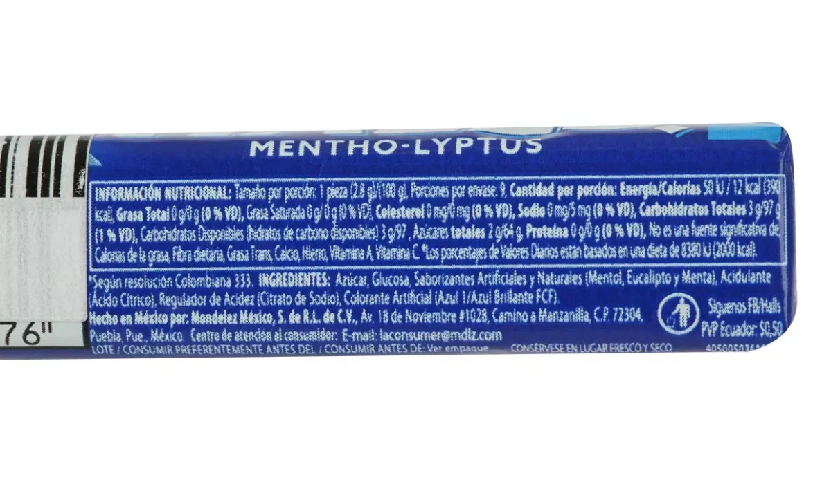 | Ingredientes | Azúcar, glucosa, saborizantes naturales y artificiales a mentol, eucalipto y menta |