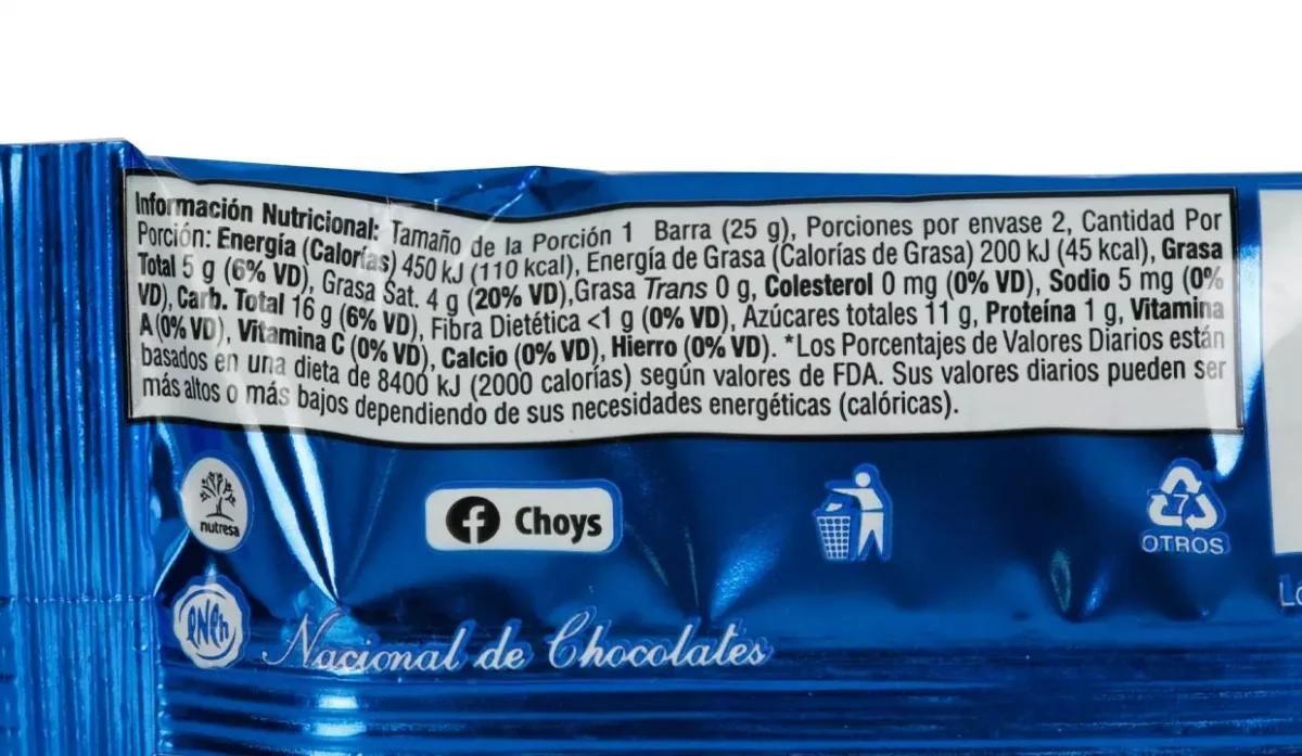 | Ingredientes | Azúcar, glucosa, grasa vegetal, maní, leche entera en polvo, cacao en polvo, suero de leche en polvo y soya |