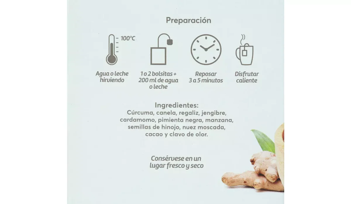| Ingredientes | Cúrcuma, canela, regaliz, jengibre, cardamomo, pimienta negra, manzana, semillas de hinojo, nuez moscada, cacao y clavo de olor |