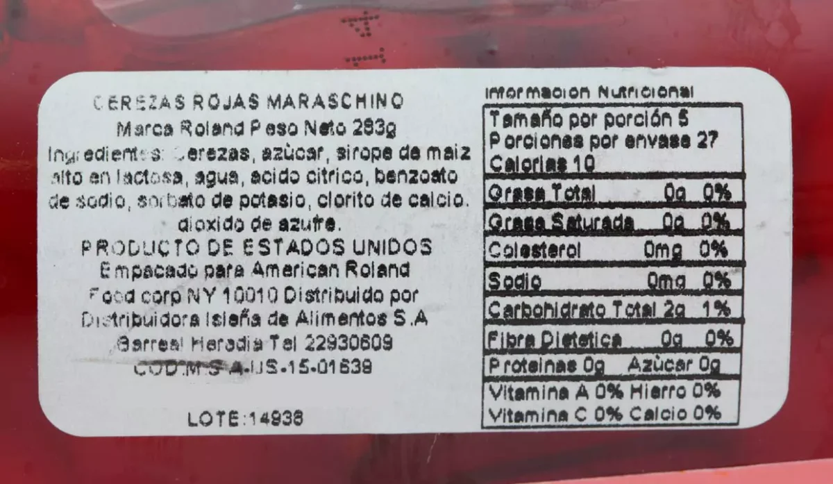 | Ingredientes | Cerezas, azúcar, sirope de maíz, agua, ácido cítrico, benzoato de sodio y clorito de calcio |