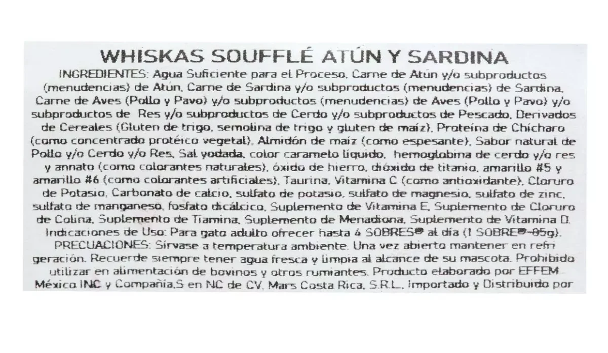 | Ingredientes | Agua, carne de atún, menudencias de atún, carne de sardina, carne de pollo y pavo, res y cerdo |