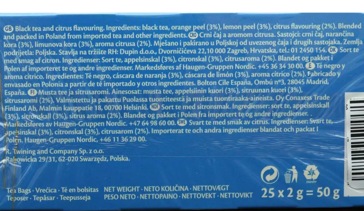 | Ingredientes | Té negro, cáscara de naranja, cáscara de limón, aroma cítrico |