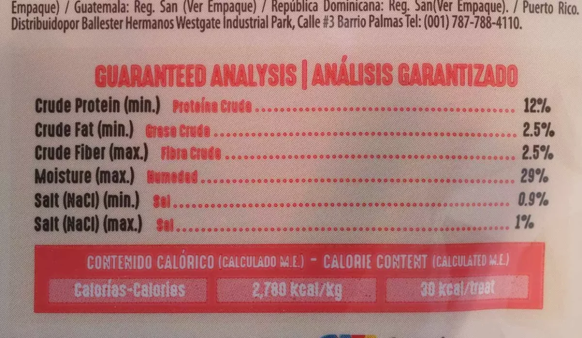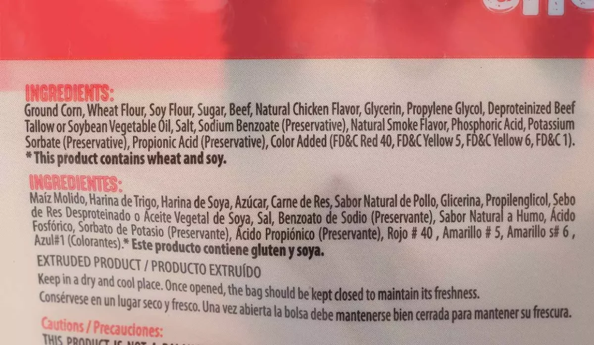 | Ingredientes | Harina de trigo, harina de soya, maíz molido, azúcar, aceite de soya, carne de res, tocino, sabor natural a pollo, gluten de trigo y sal |