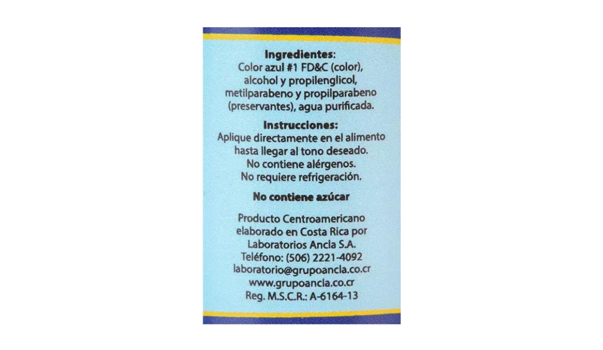 | Ingredientes | Color azul #1, alcohol, propilenglicol, metilparabeno, propilparabeno y agua |