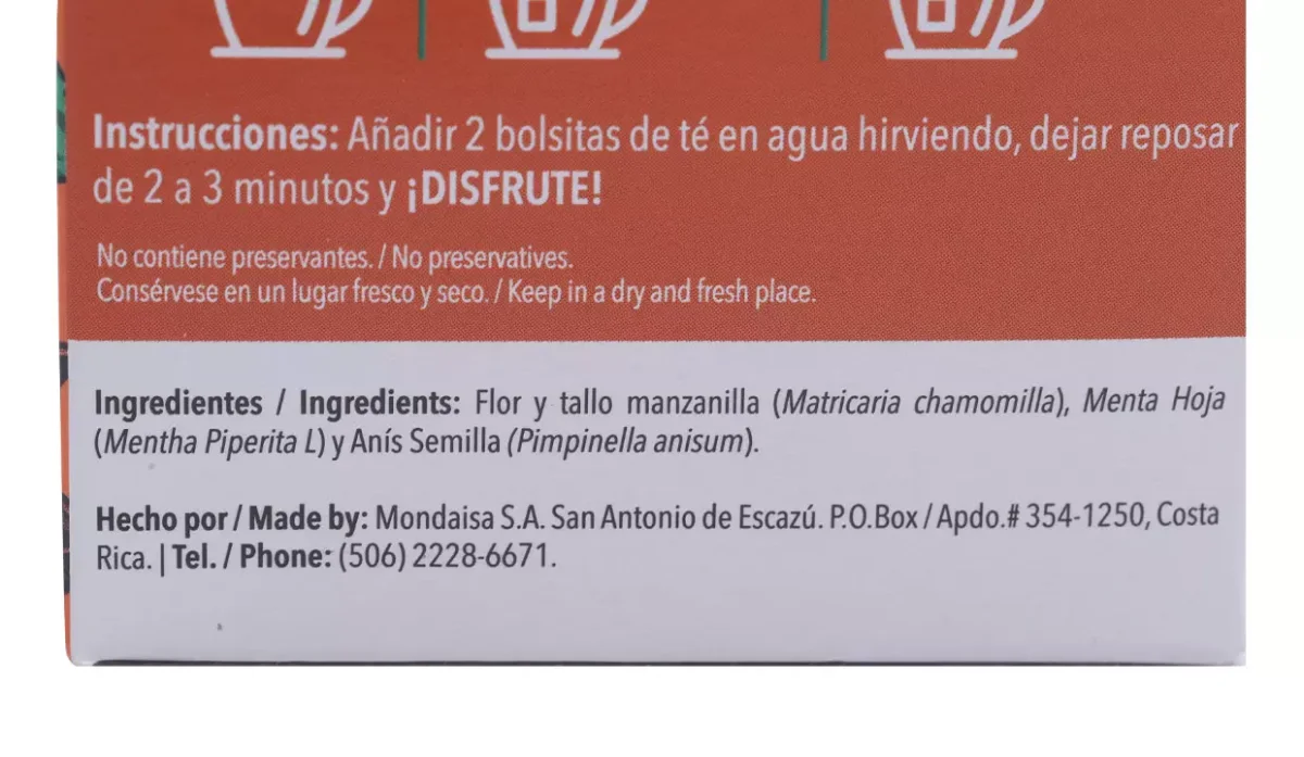 | Ingredientes | Flor, tallo de manzanilla y hoja de menta peperita |