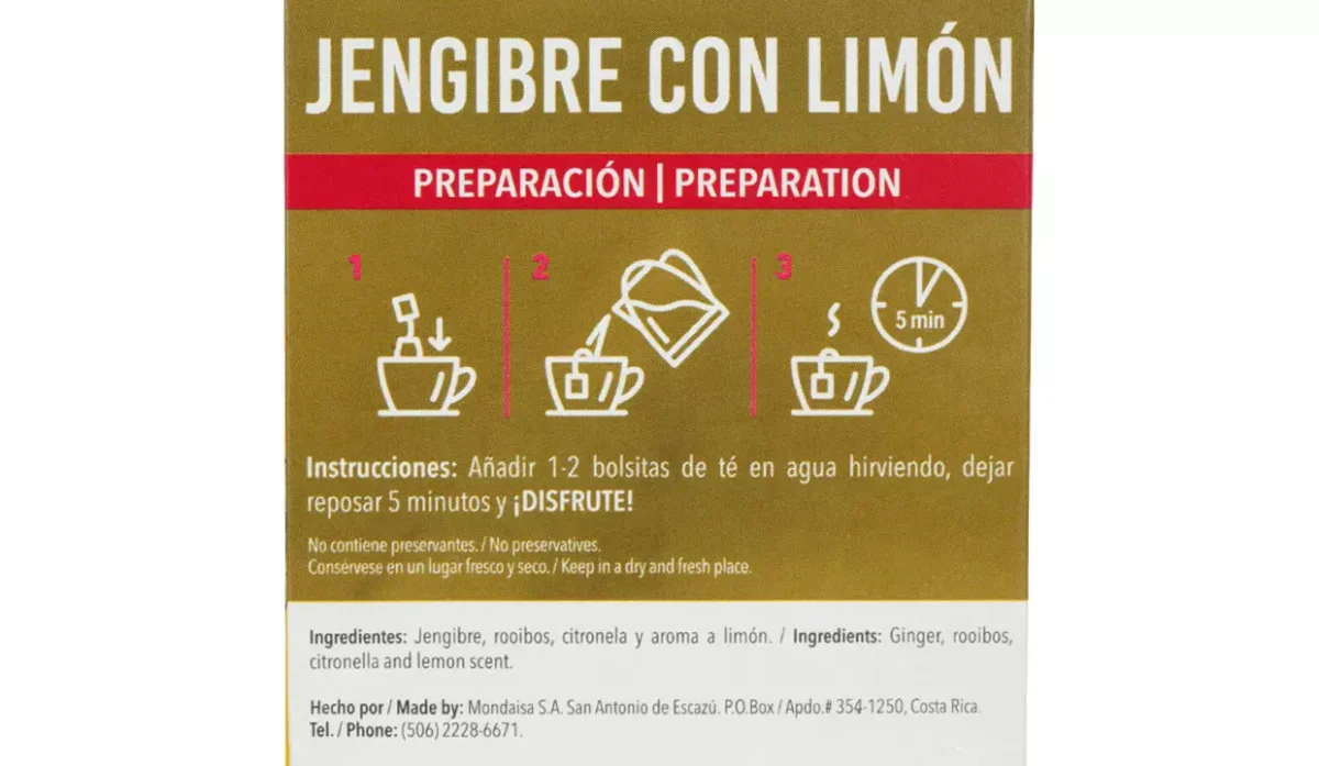 | Ingredientes | Jengibre, rooibos, citronela y aroma a limón |