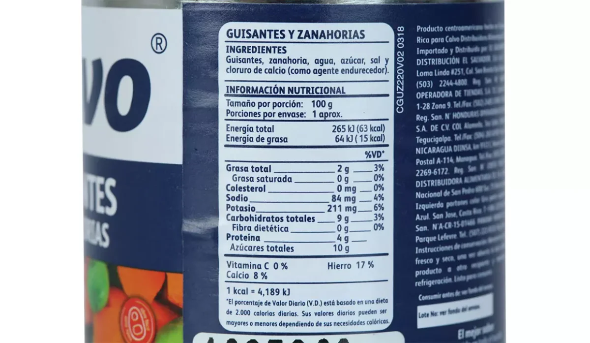| Ingredientes | Guisantes, zanahoria, agua, azúcar, sal y cloruro de calcio |