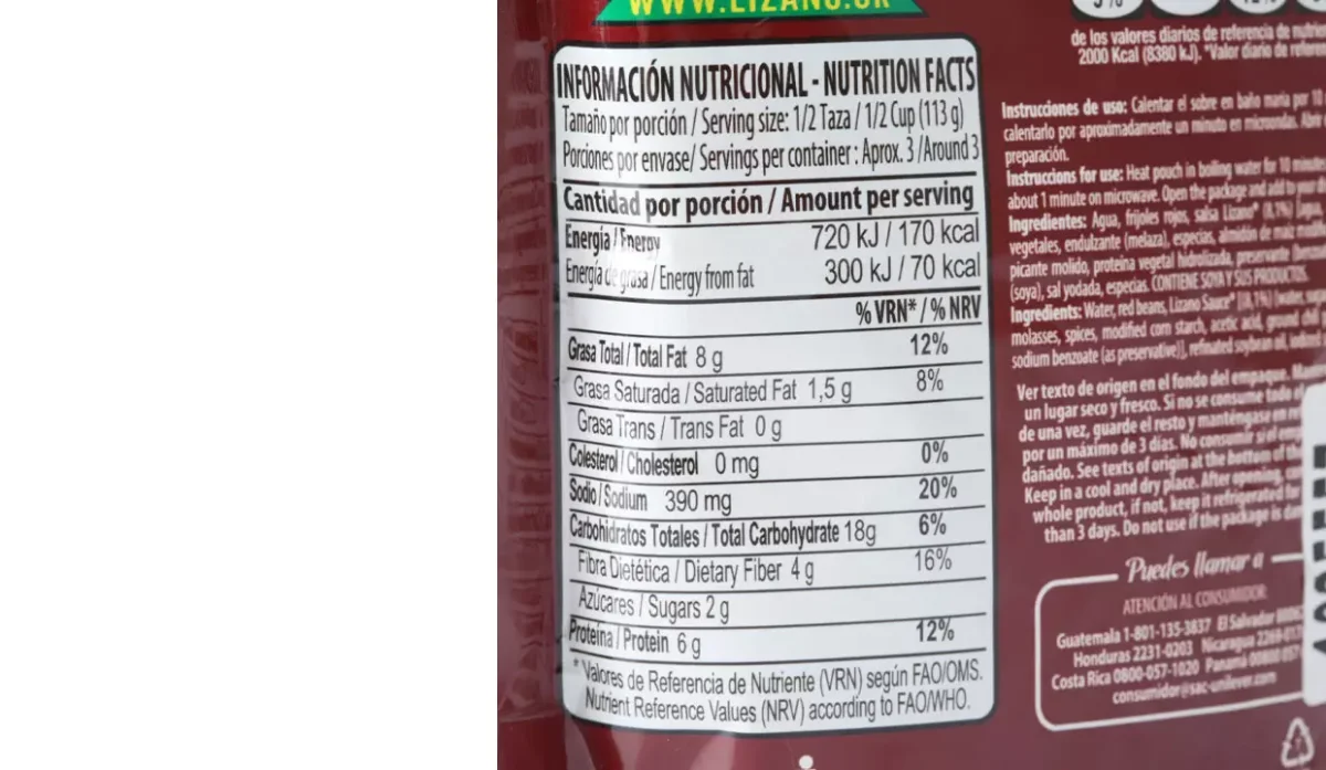 | Ingredientes | Frijoles rojos, ajo, salsa lizano, azúcar, sal yodada, pasta mixta de vegetales, especias, almidón de maíz, chile picado, cebolla, aceite y agua |