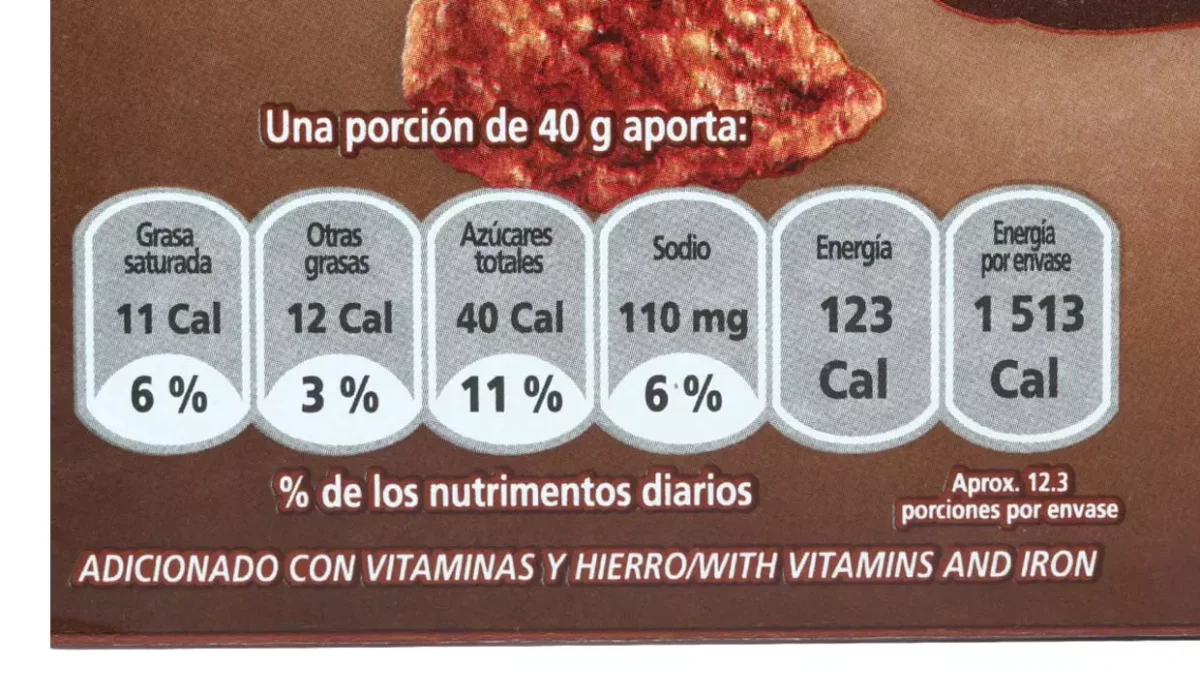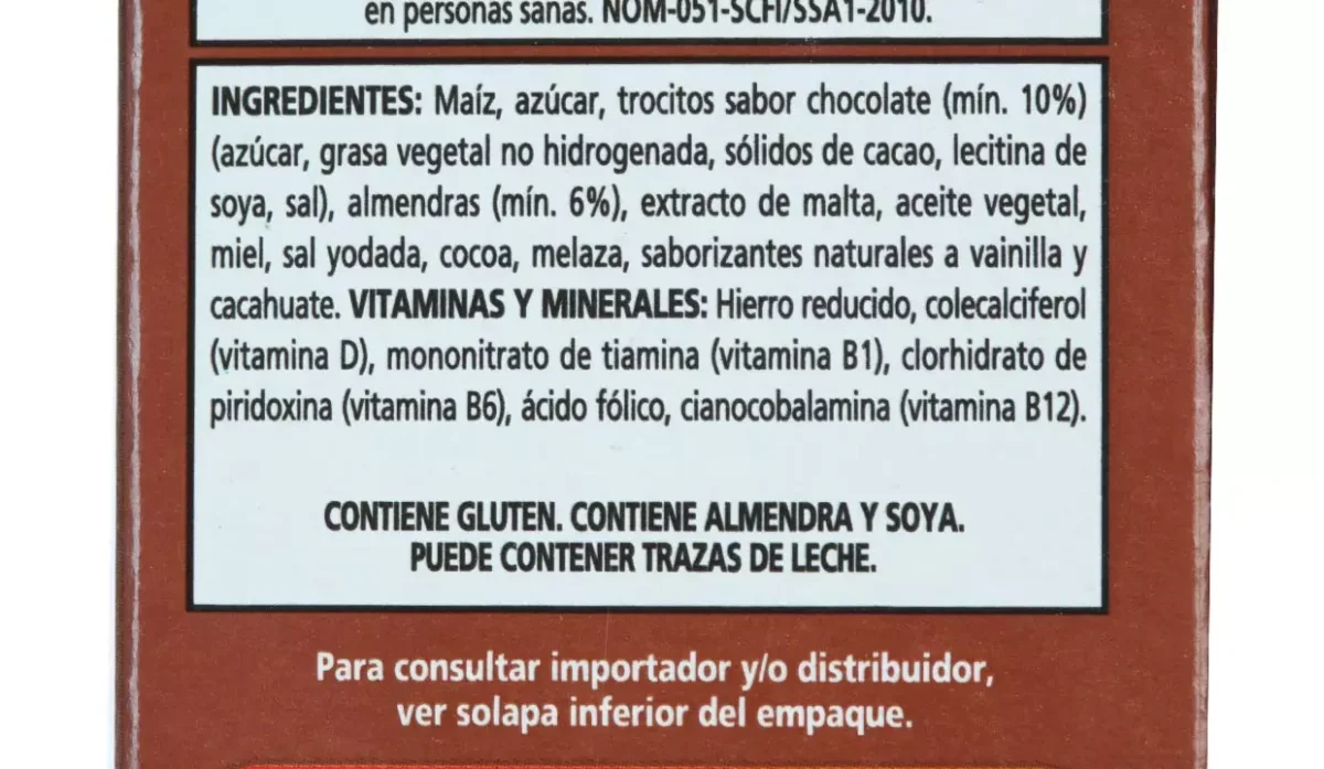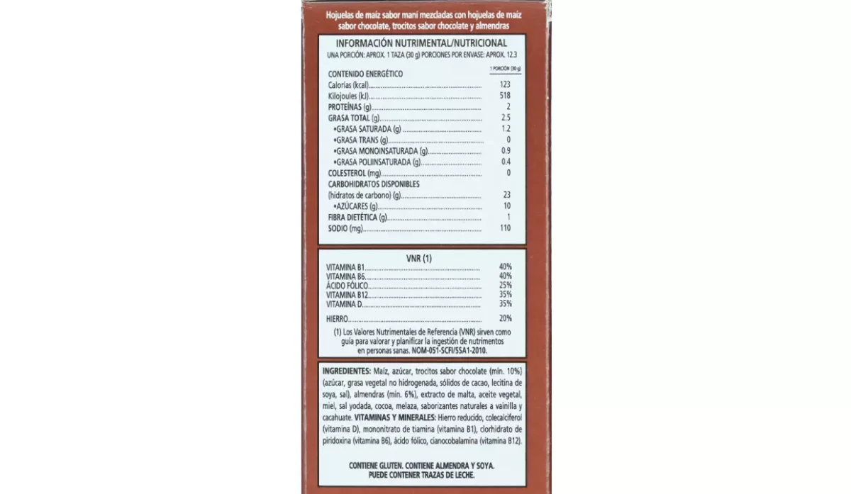 | Ingredientes | Maíz, azúcar, trocitos sabor chocolate, almendras, extracto de malta, aceite vegetal, miel, sal yodada, cacao, melaza, saborizante de vainilla, cacahuates, vitaminas y minerales |