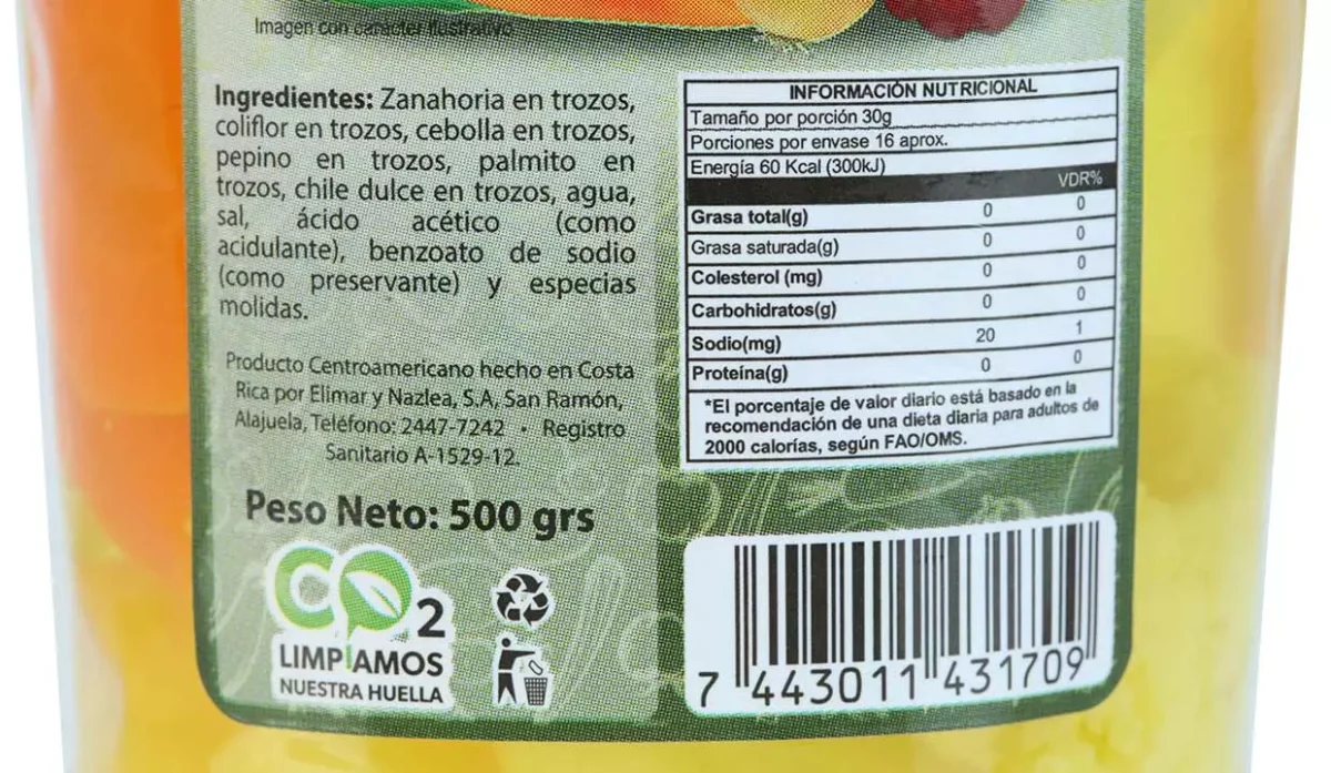 | Ingredientes | Zanahoria, coliflor, cebolla, pepino, palmito, chile dulce, agua, sal y vinagre |