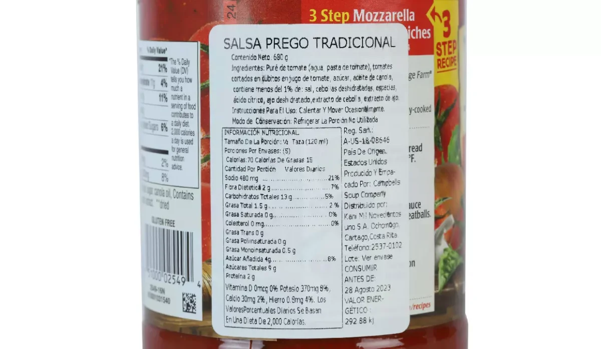 | Ingredientes | Puré de tomate,agua, pasta de tomate, tomates cortados en cubitos, azúcar, aceite de canola, sal, cebollas deshidratadas, especias, ácido cítrico, ajo deshidratado, extracto de cebolla y extracto de ajo |