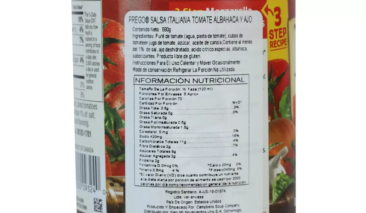 | Ingredientes | Puré de tomate, agua, pasta de tomate, cubos de tomate, azúcar, aceite de canola, albahaca, y ajo |
