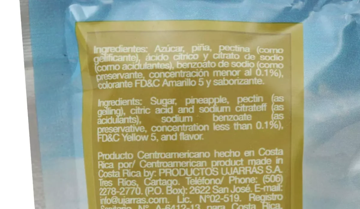| Ingredientes | Azúcar, piña, pectina, ácido cítrico, citrato de sodio, benzoato de sodio, colorante amarillo #5 y saborizante |