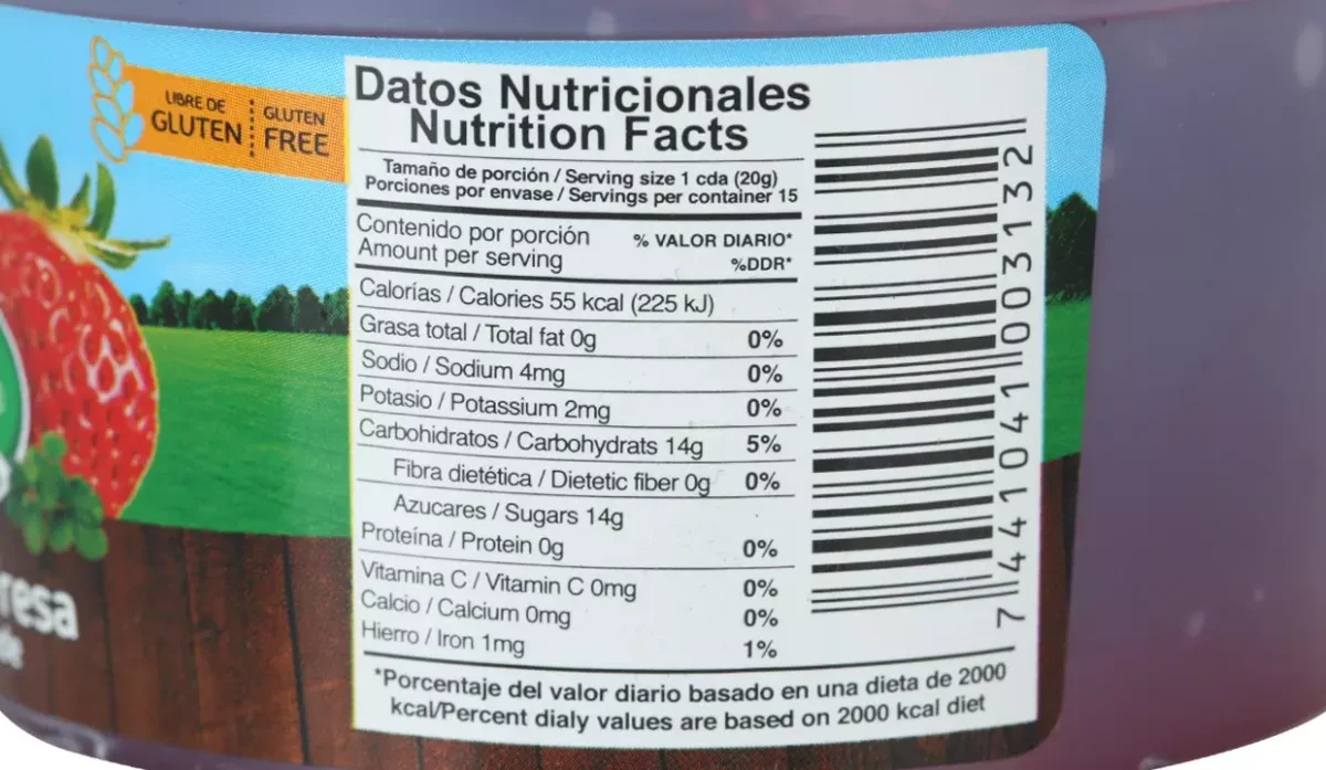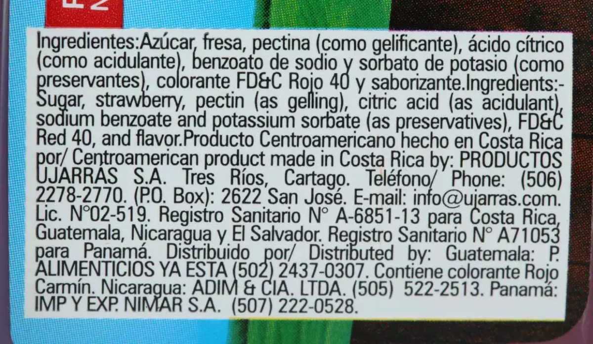| Ingredientes | Azúcar, fresa, pectina, ácido cítrico, benzoato de sodio, sorbato de potasio, colorante rojo #40 y saborizantes |