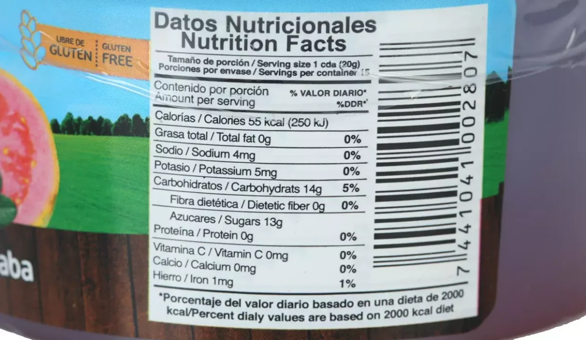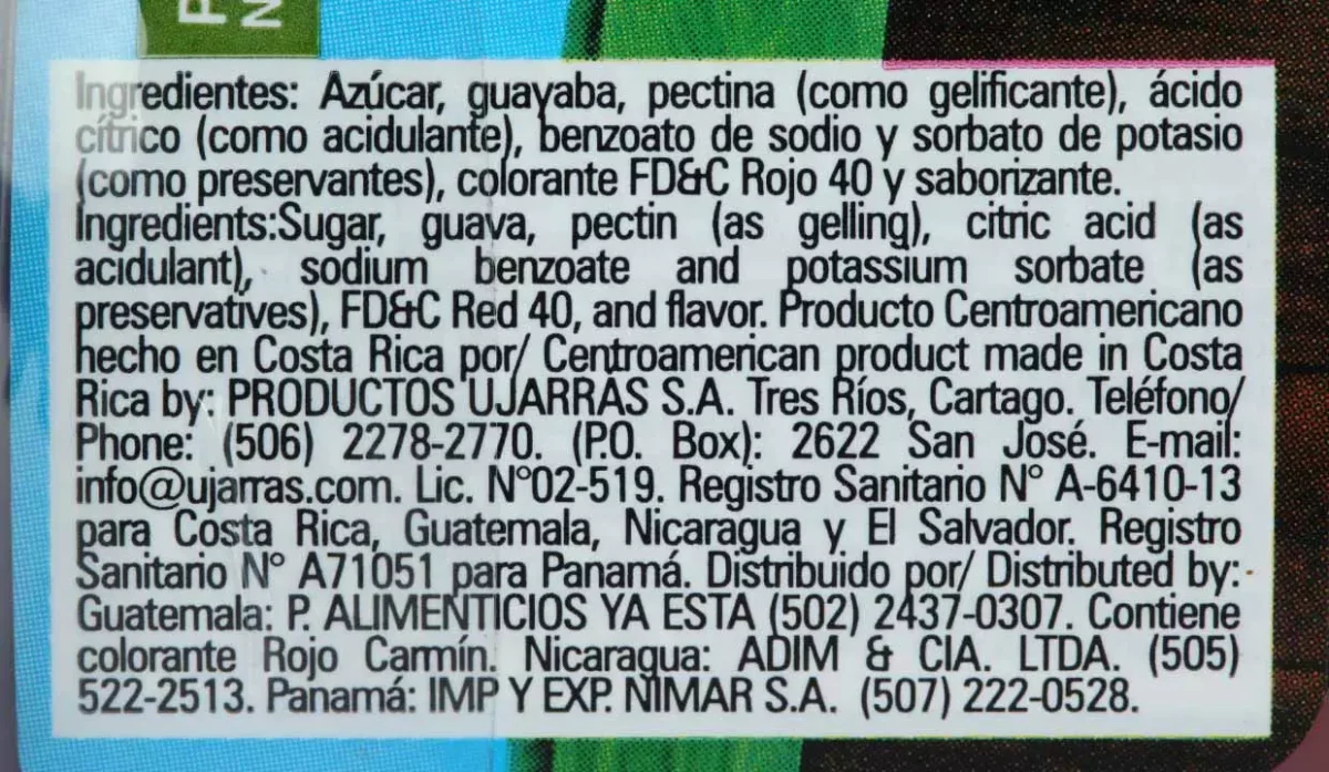 | Ingredientes | Azúcar, pulpa de guayaba, ácido cítrico, pectina, colorante rojo #40 y benzoato de sodio |