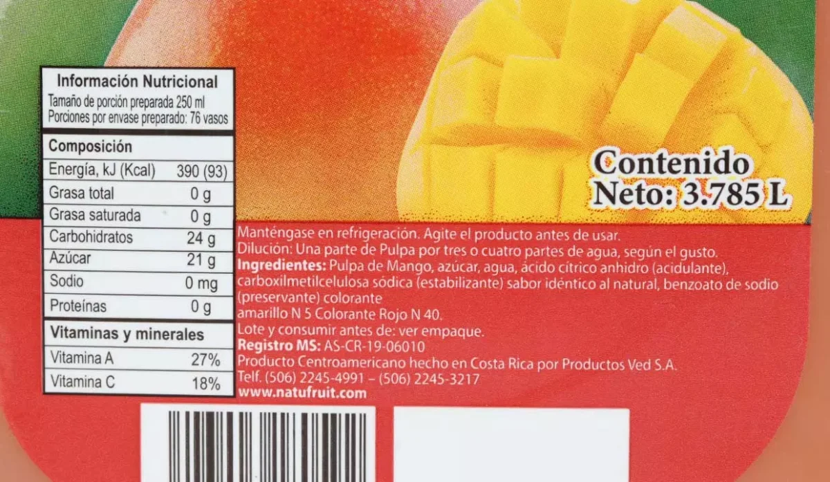 | Ingredientes | Pulpa de mango, azúcar, agua, ácido cítrico, sabor idéntico al natural |