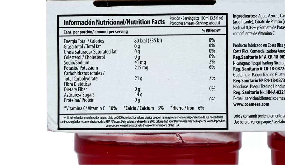 | Ingredientes | Agua, azúcar, sabor y color artificial |