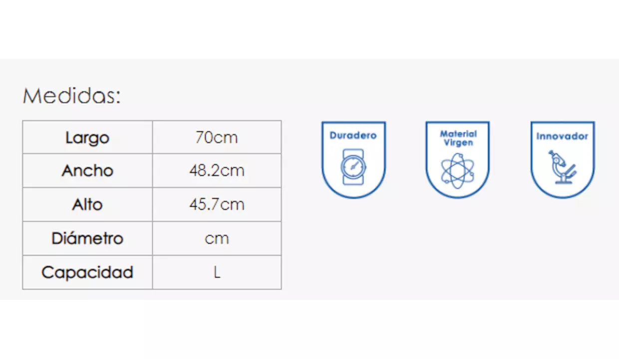 | Tamaño | 48.2 cm de ancho x 70 cm de largo x 45.7 cm de alto |