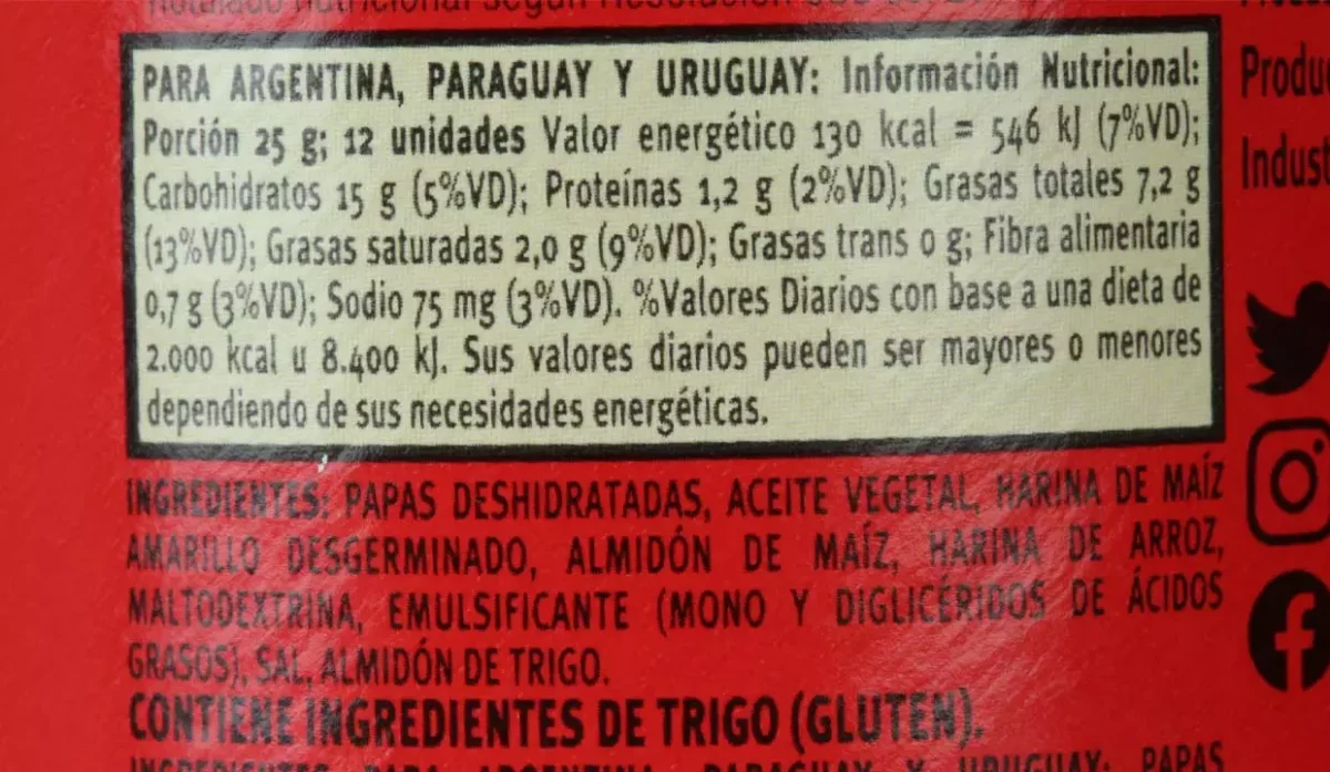 | Ingredientes | Papas deshidratadas, aceite vegetal, harina de maíz y sal |