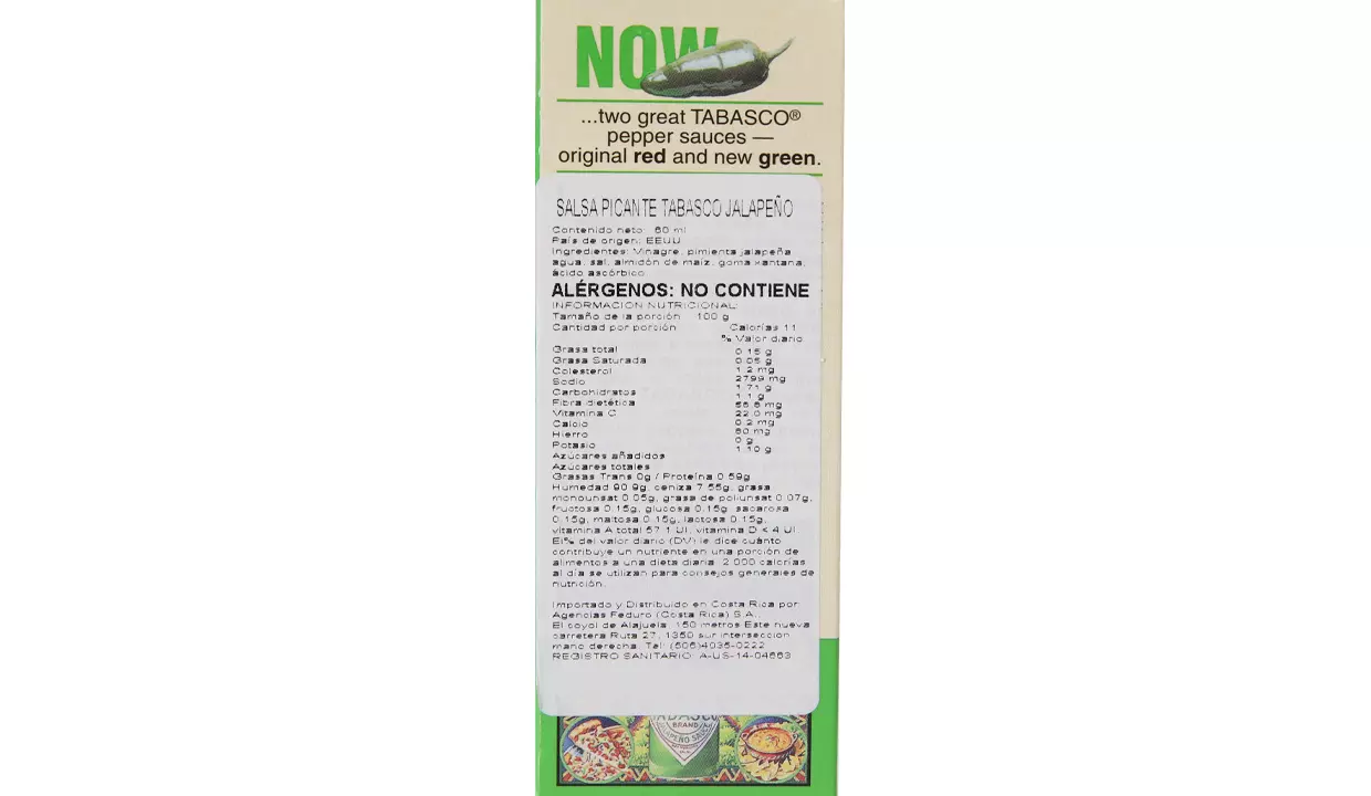 | Ingredientes | Vinagre, pimienta jalapeña, agua, sal, almidón de maíz |