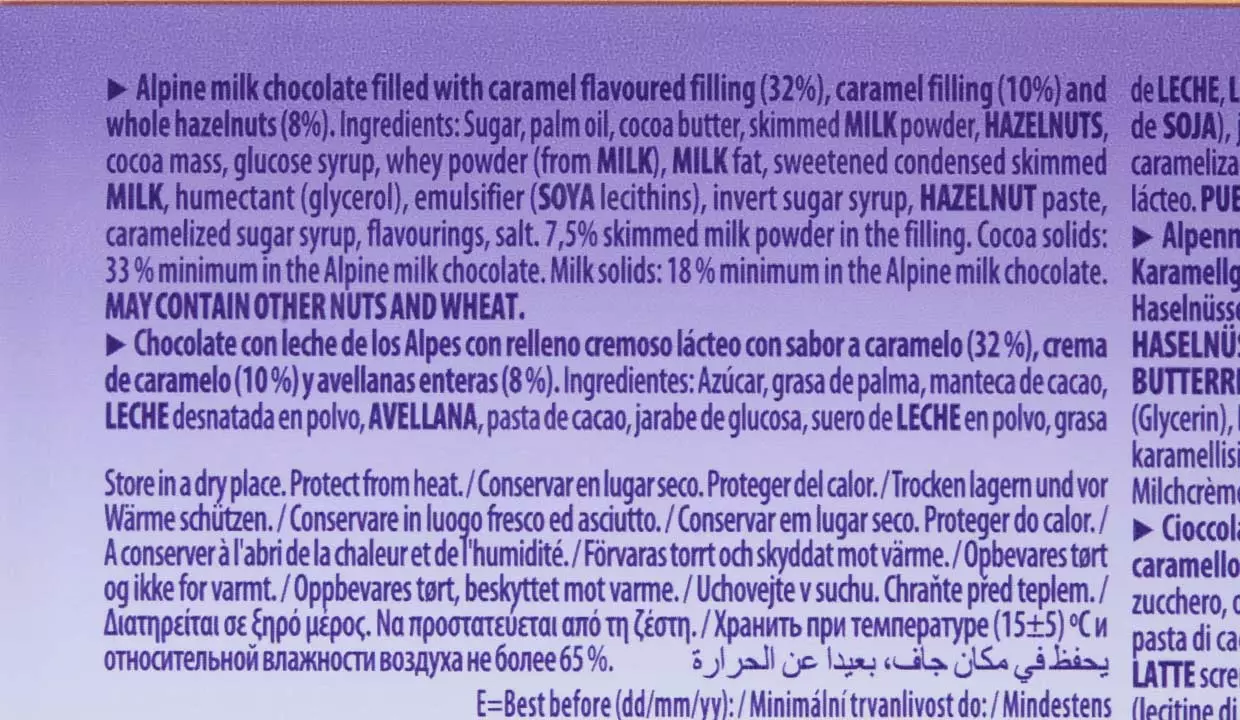 | Características | Chocolate con leche, caramelo y avellanas enteras |