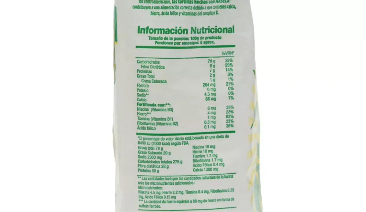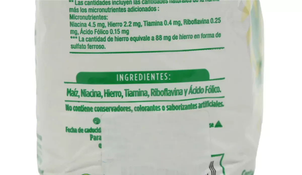 | Ingredientes | Maíz, niacina, hierro, tianina, riboflavina y ácido fólico |