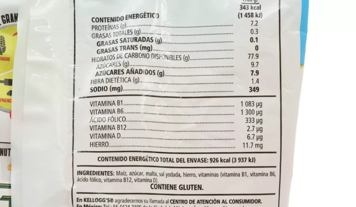 | Ingredientes | Maíz, azúcar, extracto de malta, sal yodada, hierro, vitamina B1, B6 y D |