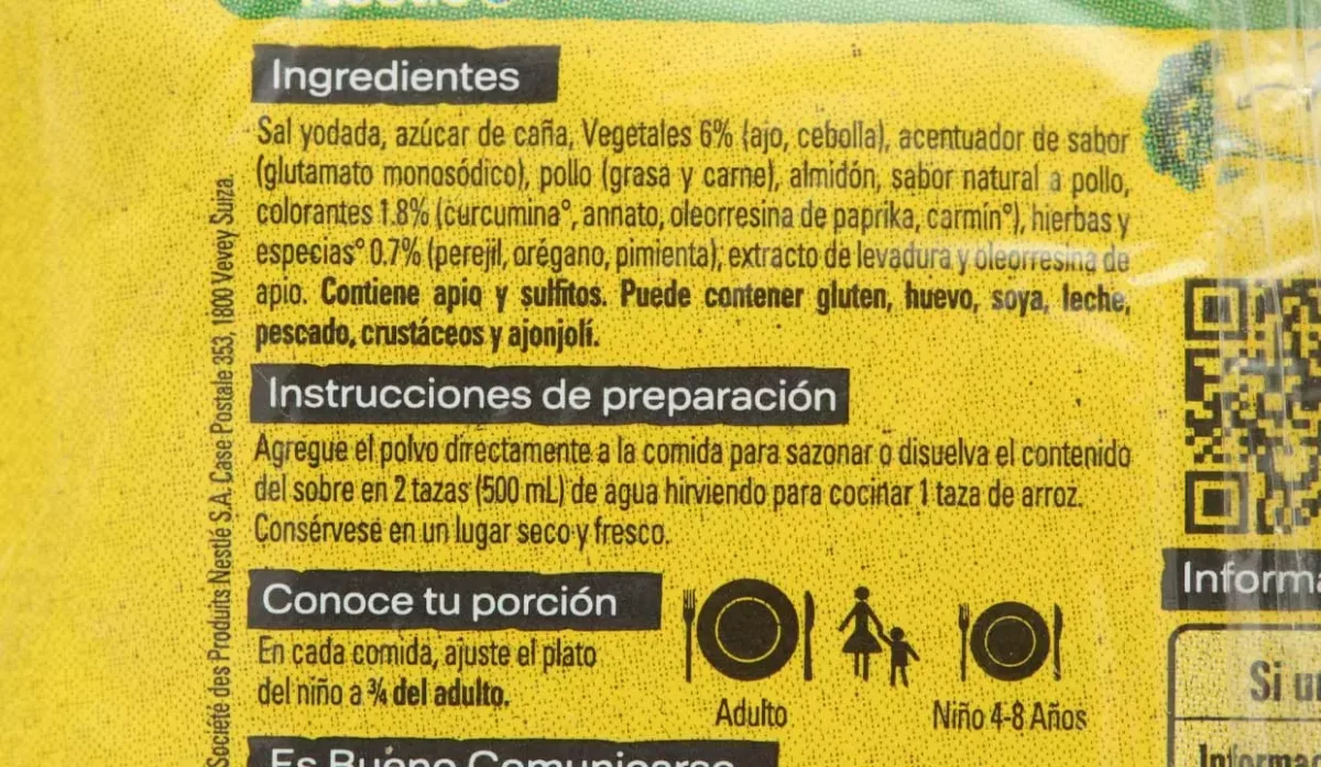 | Ingredientes | Sal yodada, almidón de maíz, azúcar, acentuadores de sabor, grasa vegetal, carne de pollo, grasa de pollo, colorantes artificiales, cebolla, ajo, apio, perejil y hierbas |