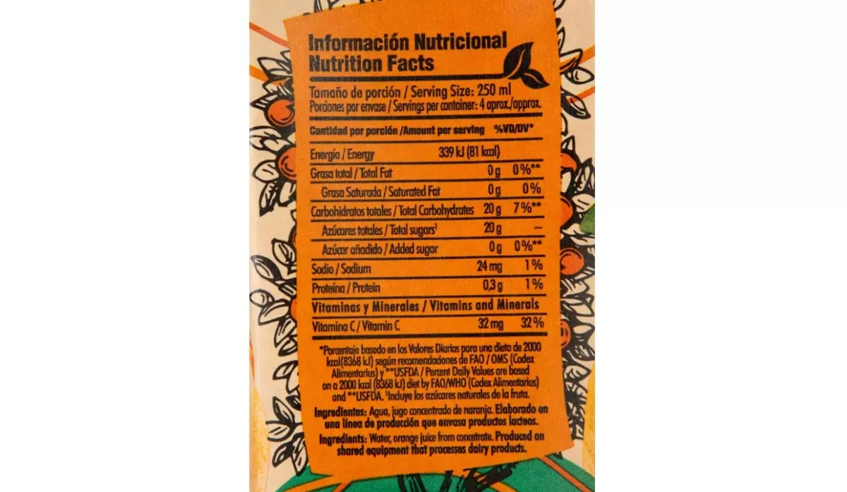 | Ingredientes | Agua, jugo concentrado de naranja |
