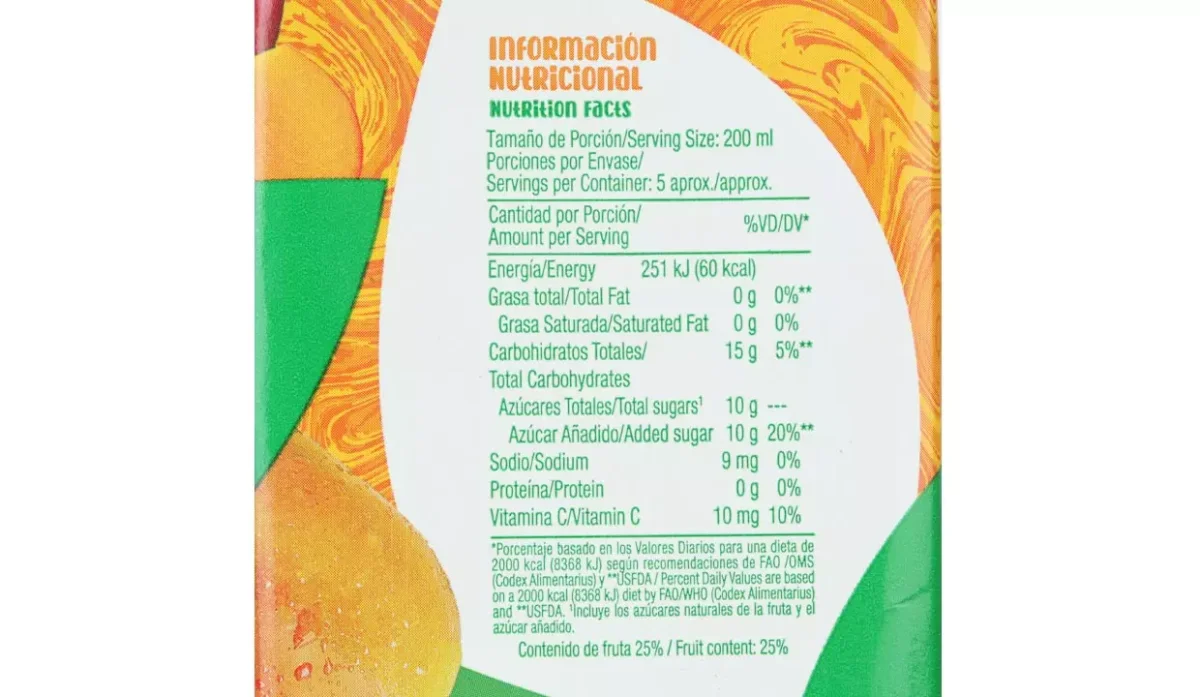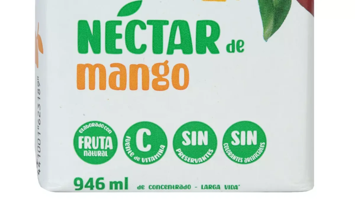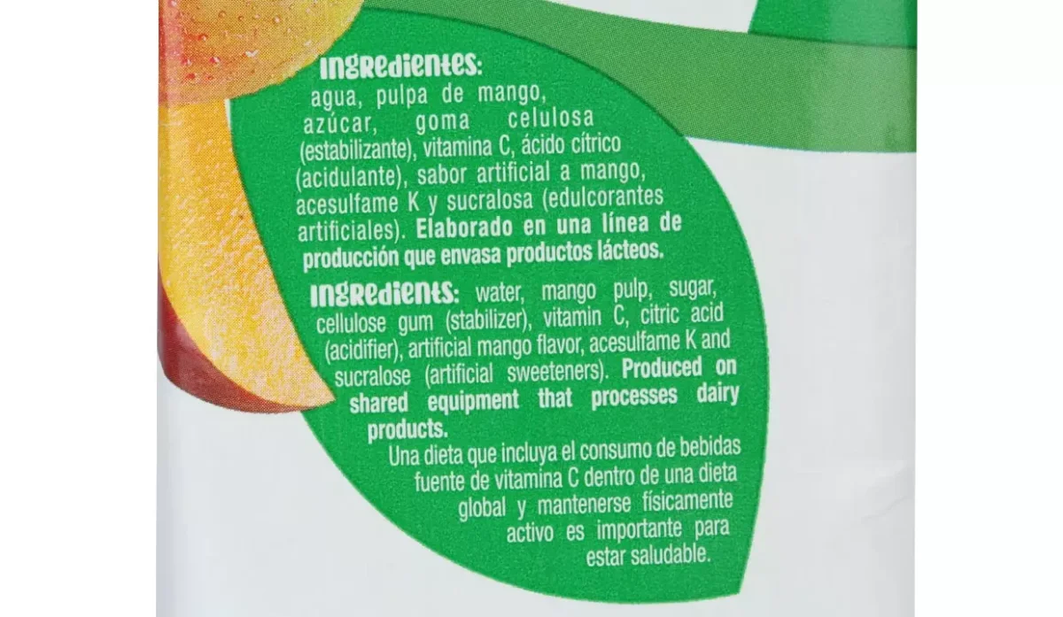| Ingredientes | Agua, pulpa de mango, azúcar, goma celulosa, vitamina C, ácido cítrico, sabor artificial a mango, acesulfame K y sucralosa |