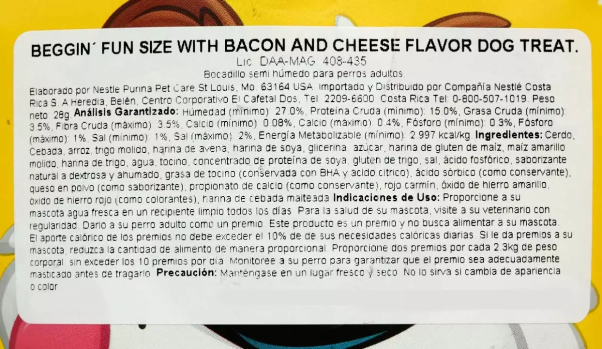 | Ingredientes | Cerdo, cebada, arroz, trigo molido, harina de avena, harina de soya, glicerina, azúcar, harina de gluten de maíz, maíz amarillo molido, harina de trigo, agua, tocino, concentrado de proteína de soya, gluten de trigo, sal, ácido sórbico, queso en polvo, propionato de calcio |