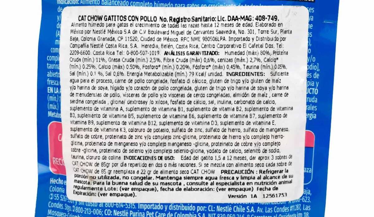 | Ingredientes | Agua suficiente para proceso, carne de pollo, gluten de trigo y/o gluten de maíz y/o harina de soya, carne de pescado (sardina y/o tilapia y/o atún), almidón de maíz, ortofosfato y/o carbonato de calcio, hígado y/o corazón de pollo, hígado y/o vísceras de cerdo, saborizante cárnico artificial y natural, sal**, vitaminas (A, D-3, E, K-3, Complejo B, cloruro de colina), cloruro de potasio, taurina, minerales , levadura de cervecería inactiva |