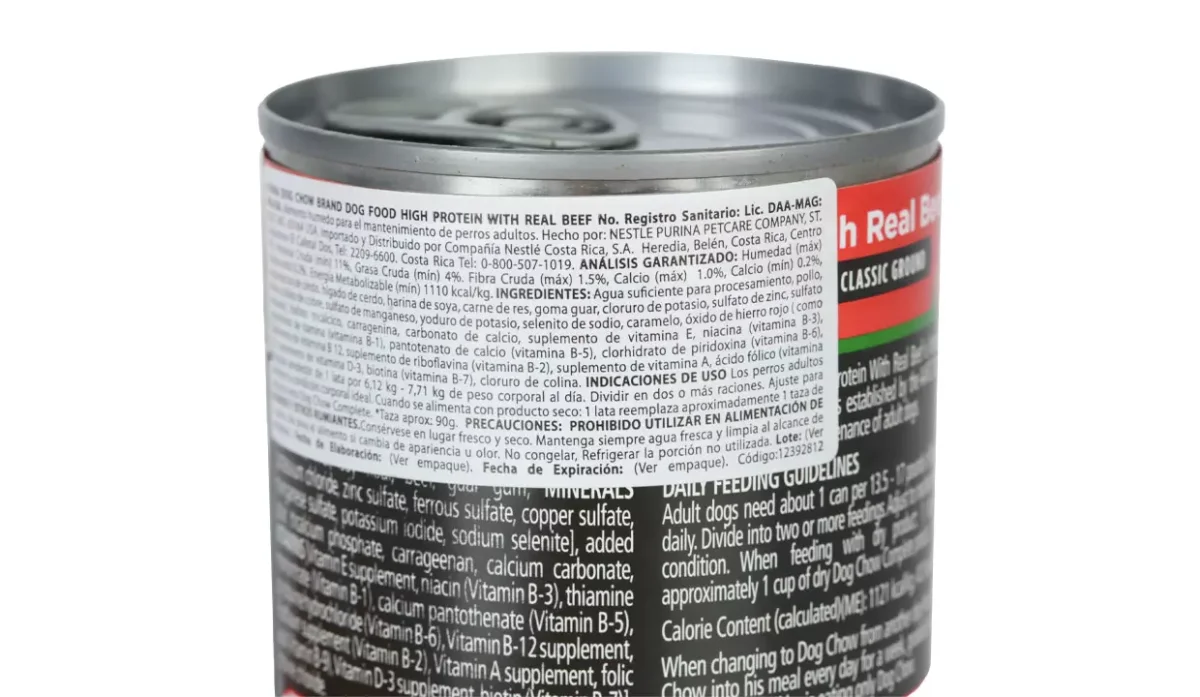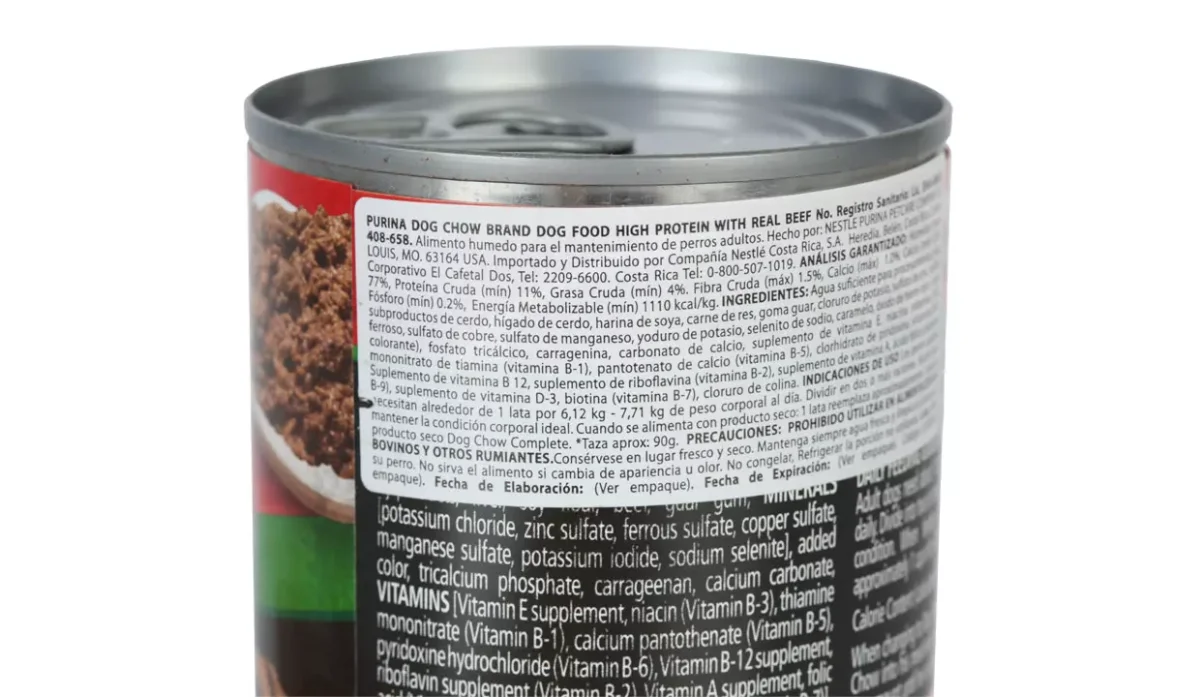 | Ingredientes | Agua suficiente para el procesamiento, pollo, subproductos de cerdo, hígado de cerdo, harina de soya, carne de res, goma guar, cloruro de potasio, sulfato de zinc, sulfato ferroso, sulfato de cobre, sulfato de magneso, yoduro de potasio, selenio de sodio, caramelo, óxido de hierro rojo, fosfato tricálcico, carragenina, carbonato de calcio, suplemento de vitamina E, niacina, vitamina B-3, mononitrato de tiamina, vitamina B-1, pantotenato de calcio, vitamina B-5, clorhidrato de piridoxina |