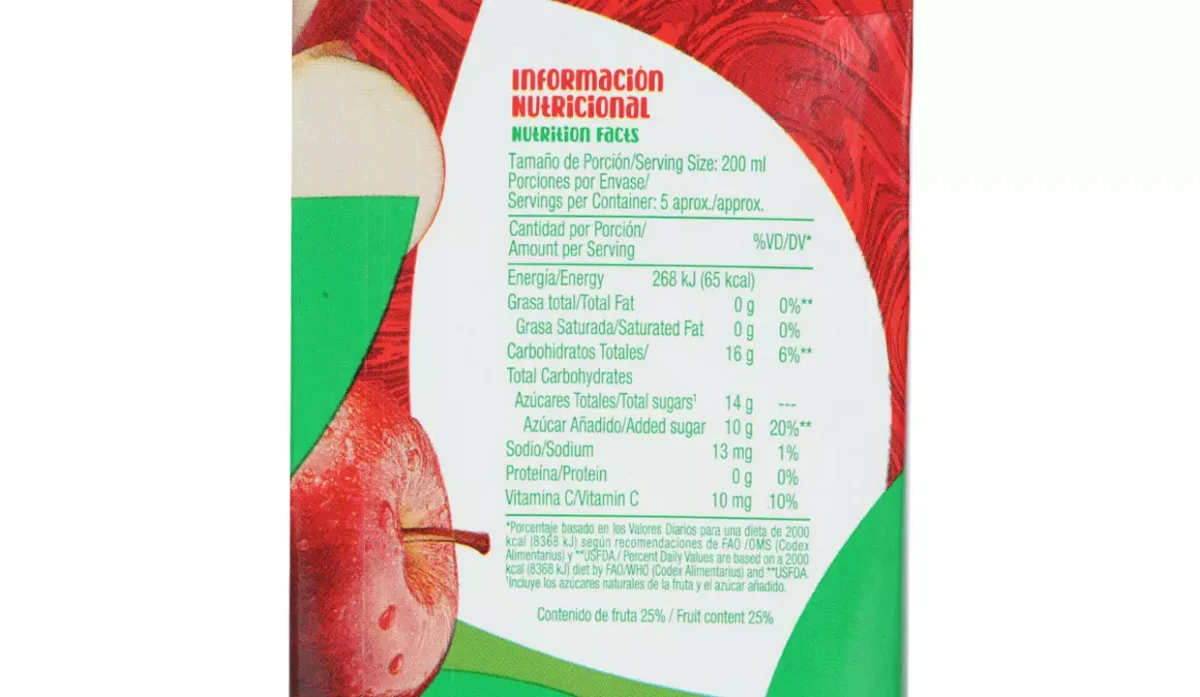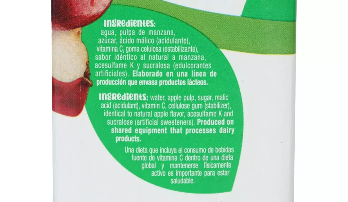 | Ingredientes | Agua, pulpa de manzana, azúcar, ácido málico, vitamina C, goma celulosa, sabor idéntico al natural a manzana, acesulfame K y sucralosa |