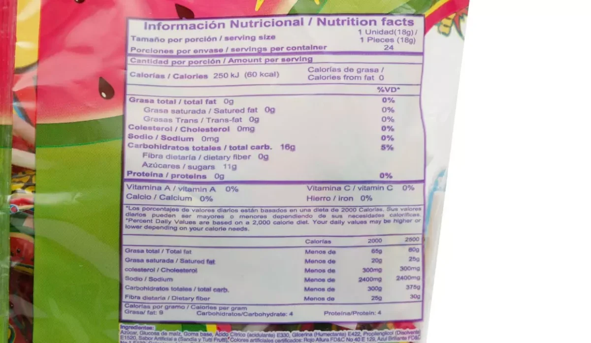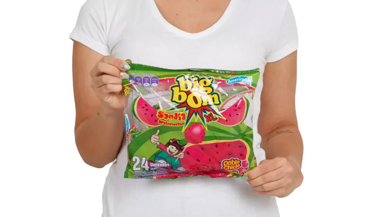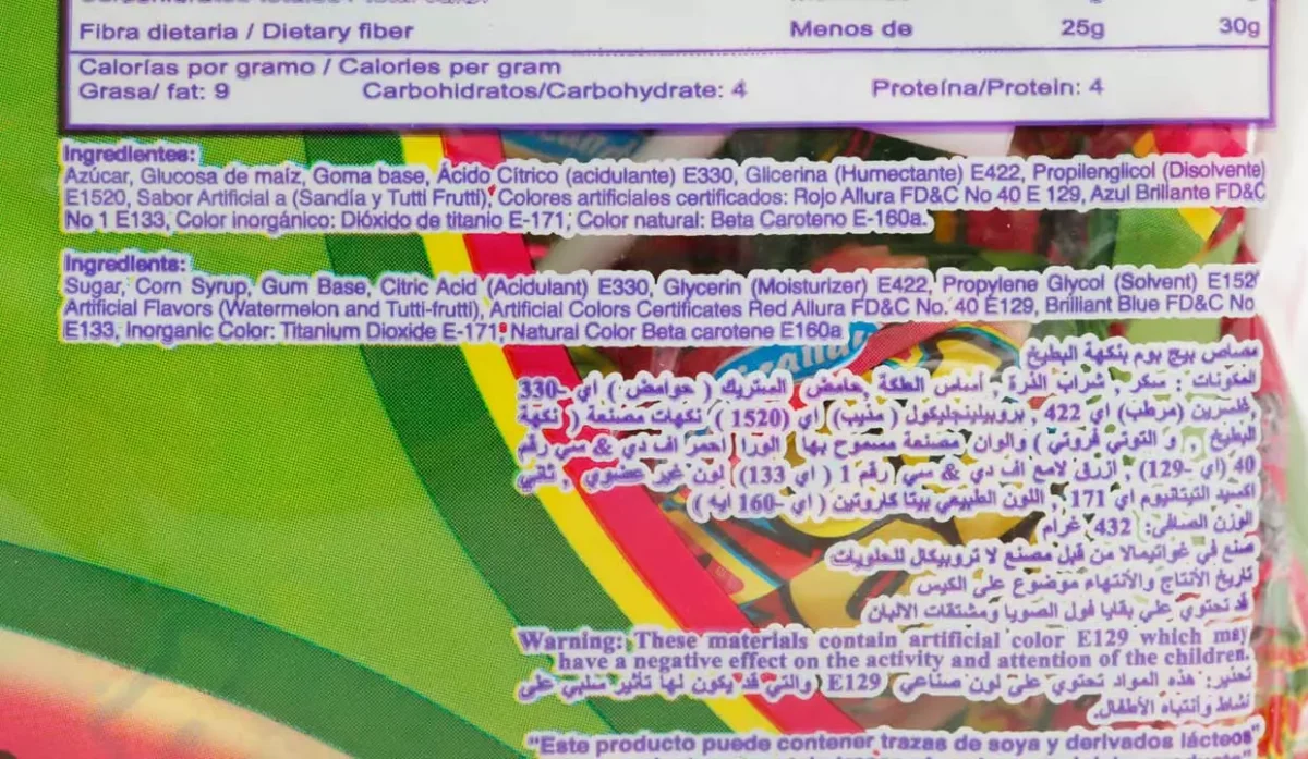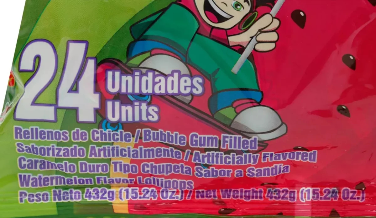 | Ingredientes | Azúcar, glucosa de maíz, goma base, ácido cítrico, glicerina, propilenglicol, sabro artificial sandía, colores artificiales certificados |