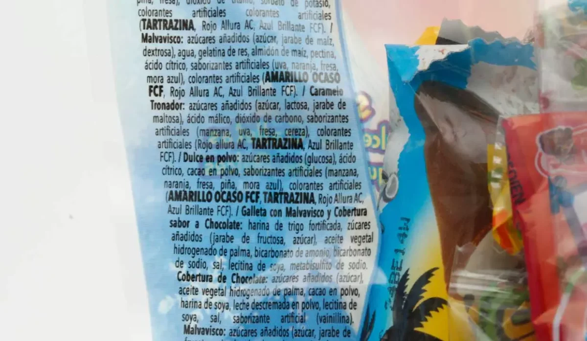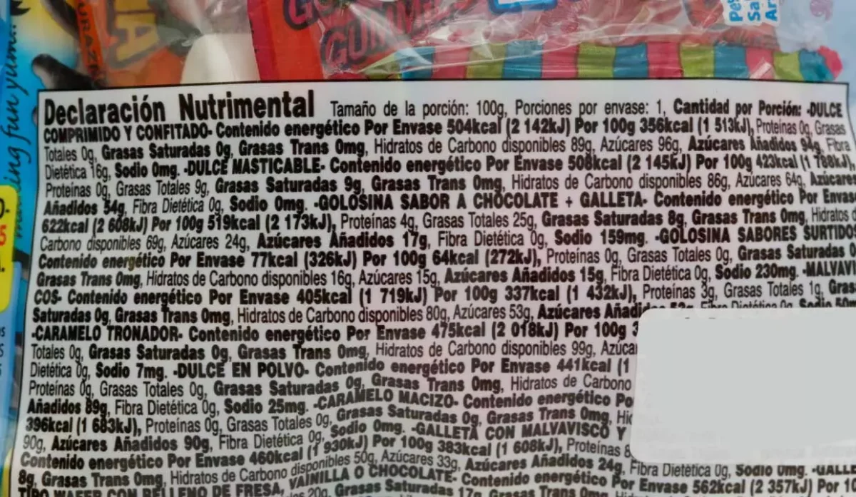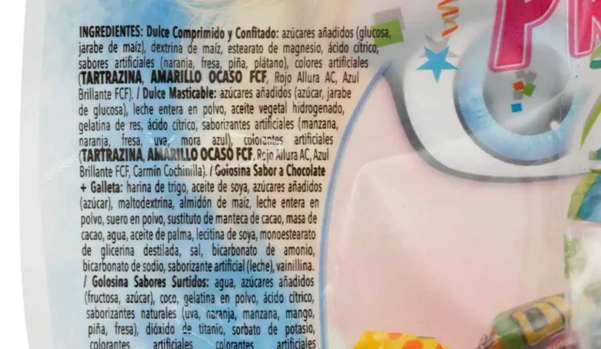 | Ingredientes | Dulce comprimido y confita, azúcares añadidos, glucosa, jarabe de maíz, dextrina de maíz, estearato de magnesio, ácido cítrico, sabores artificiales, colores artificiales |