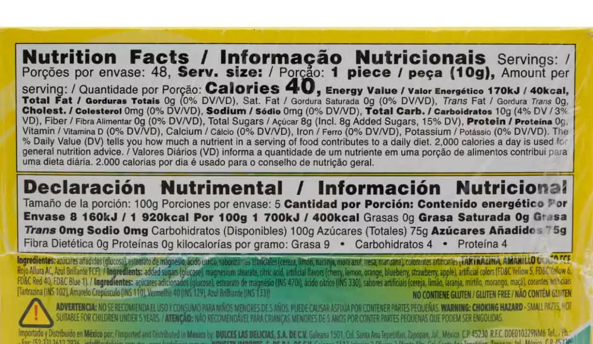 | Ingredientes | Azúcares añadidos, glucosa, estearato de magnesio, ácido cítrico, saborizantes artificiales a cereza, limón, naranja, mora azul, fresa y manzana, colores artificiales |