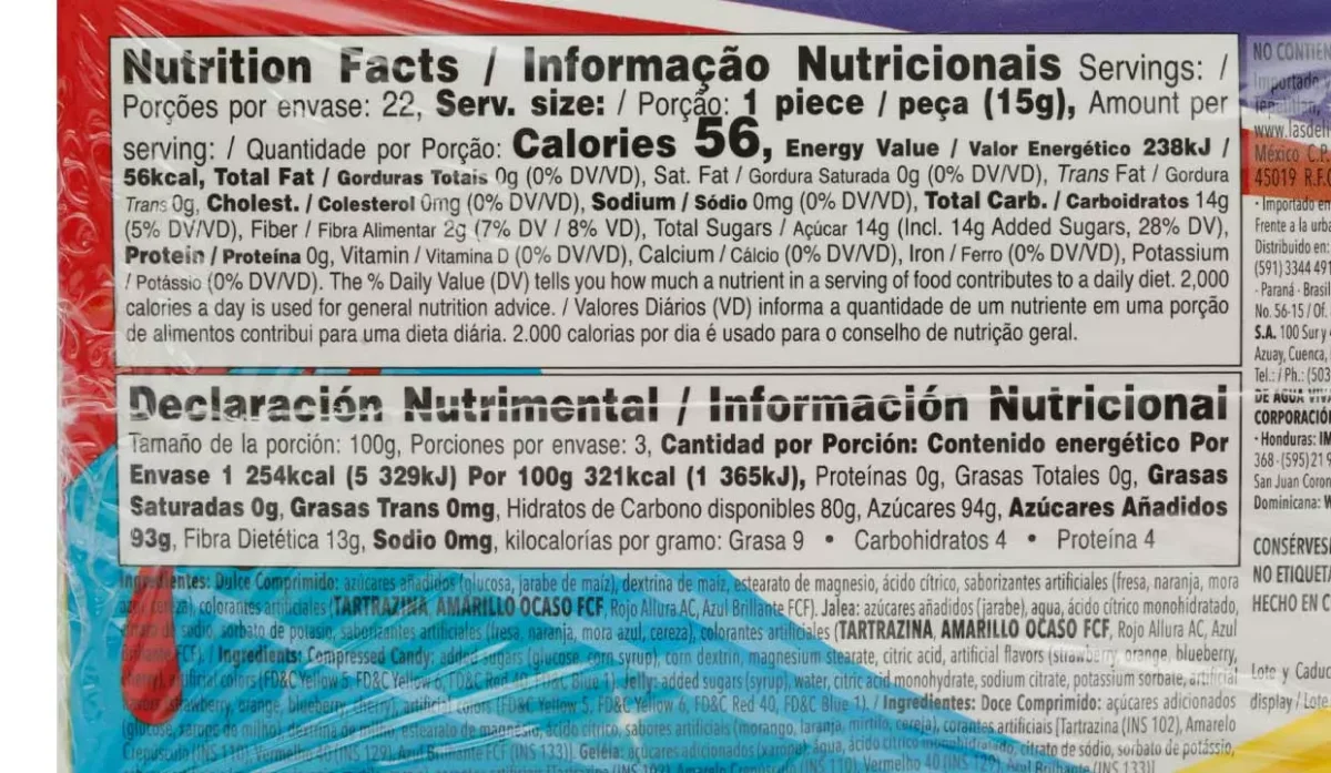 | Ingredientes | Azúcares añadidos, glucosa, jarabe de maíz, estearato de magnesio, ácido cítrico, saborizantes artificiales, colorantes artificiales, jalea, agua, ácido cítrico monohidratado, sorbato de potasio |