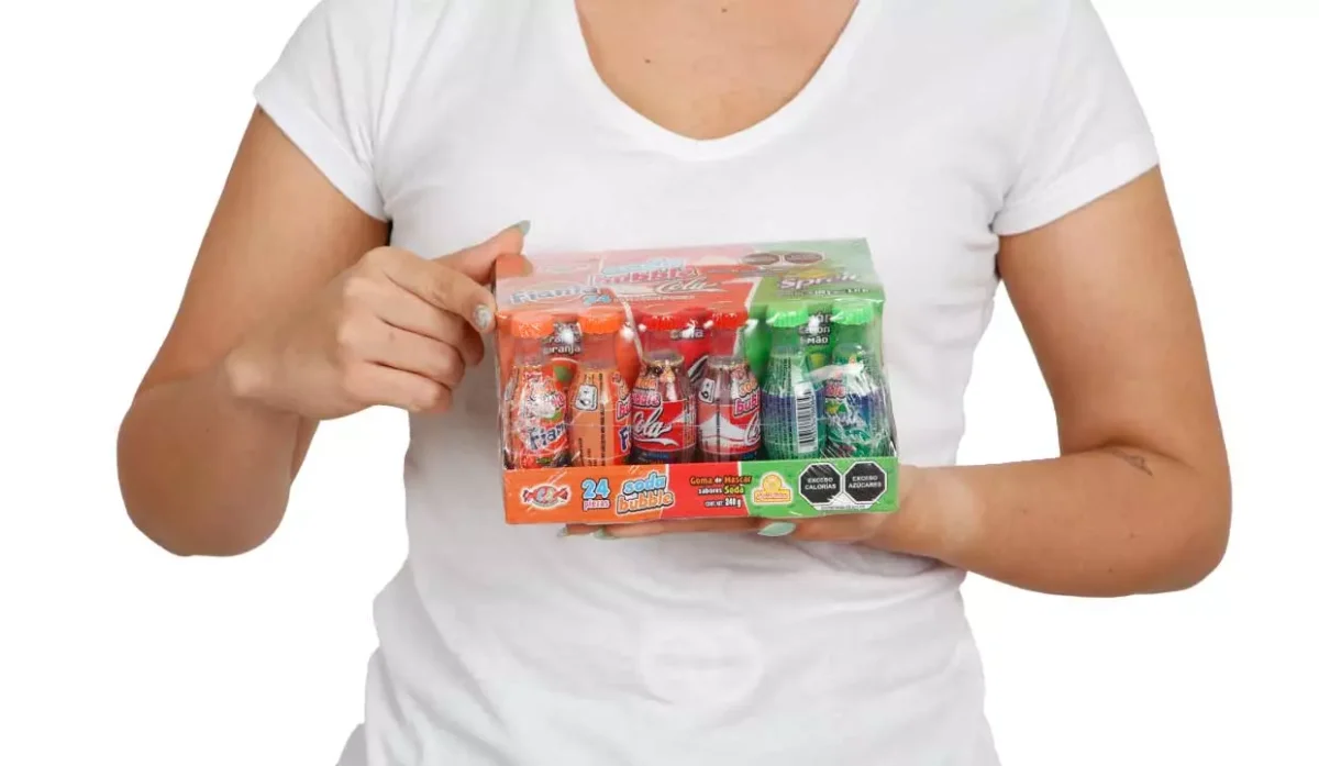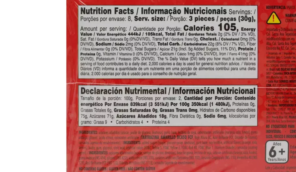 | Ingredientes | Azúcares añadidos, azúcar, jarabe de glucosa, dextrosa, goma base, lecitina de soya, saborizantes artificiales, goma arábiga, glicerol, ácido cítrico, colorantes artificiales y tartrazina |