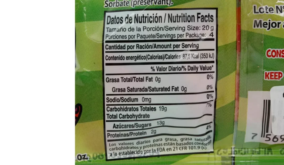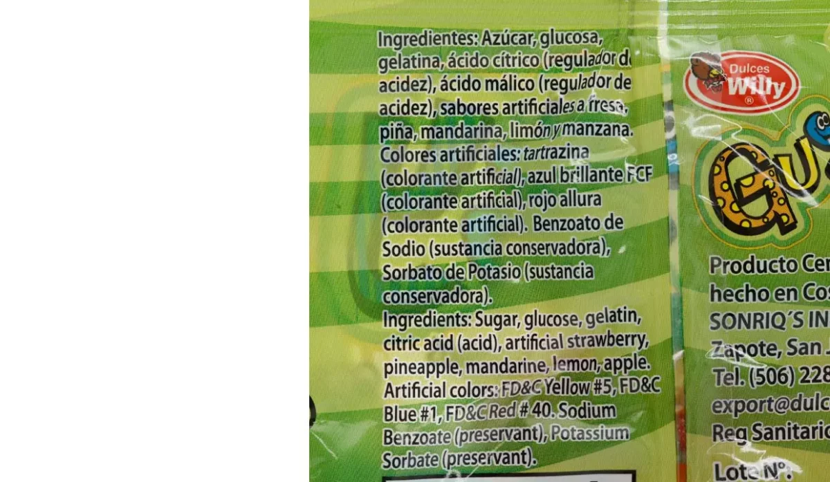| Ingredientes | Azúcar, glucosa, gelatina, ácido cítrico, ácido málico, sabores artificiales a fresa, piña, mandarina, limón y manzana, colores artificiales, tartrazina, benzoato de sodio, sorbato de potasio |