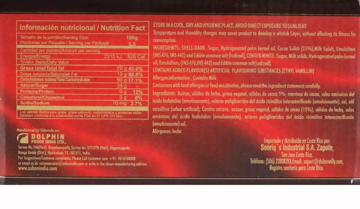 | Características | Barra de chocolate relleno de crema |