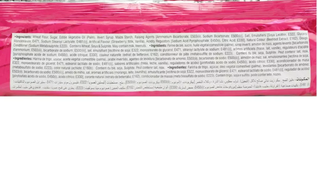 | Ingredientes | Harina de trigo, azúcar, aceite vegetal comestible, jarabe invertido, agentes de levadura, almidón de maíz, sal, emulsionantes, lecitina de soja, monoestearato de glicerol, esteaoril lactilato de sodio, sabores artificiales a fresa, leche y vainilla, reguladores de acidez, ácido cítrico, acondicionador de masa y color natural |