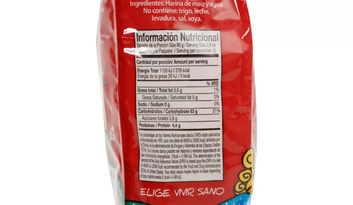 | Ingredientes | Harina de maiz, agua, levadura, sal y soya |