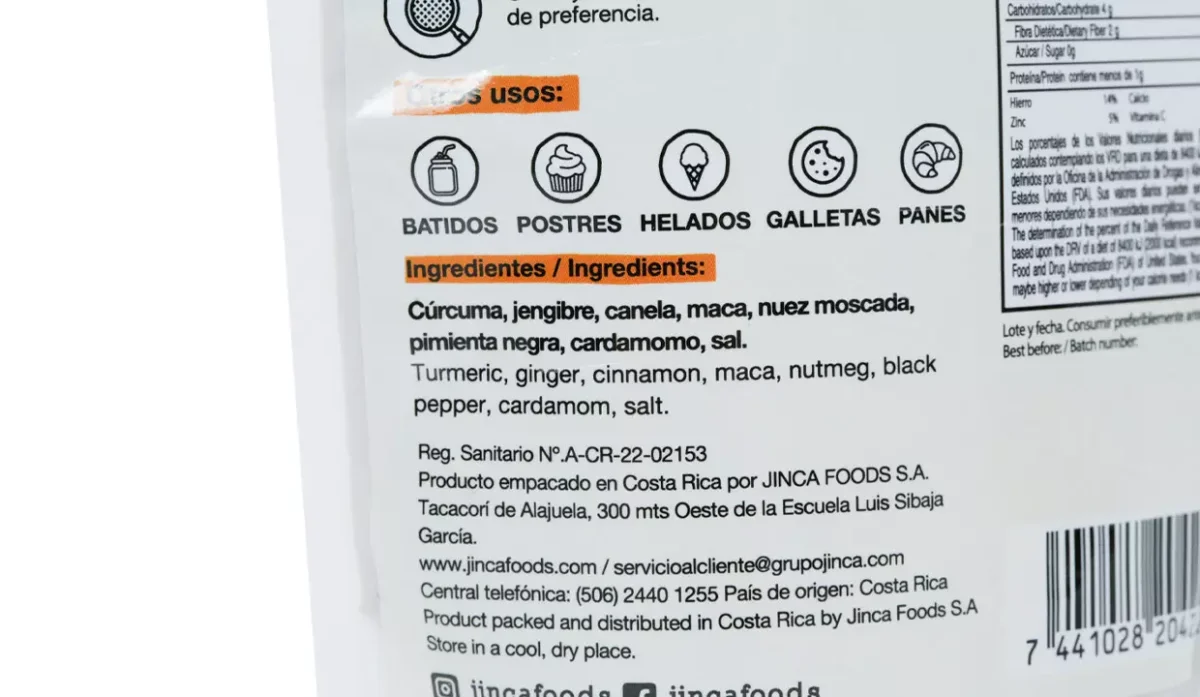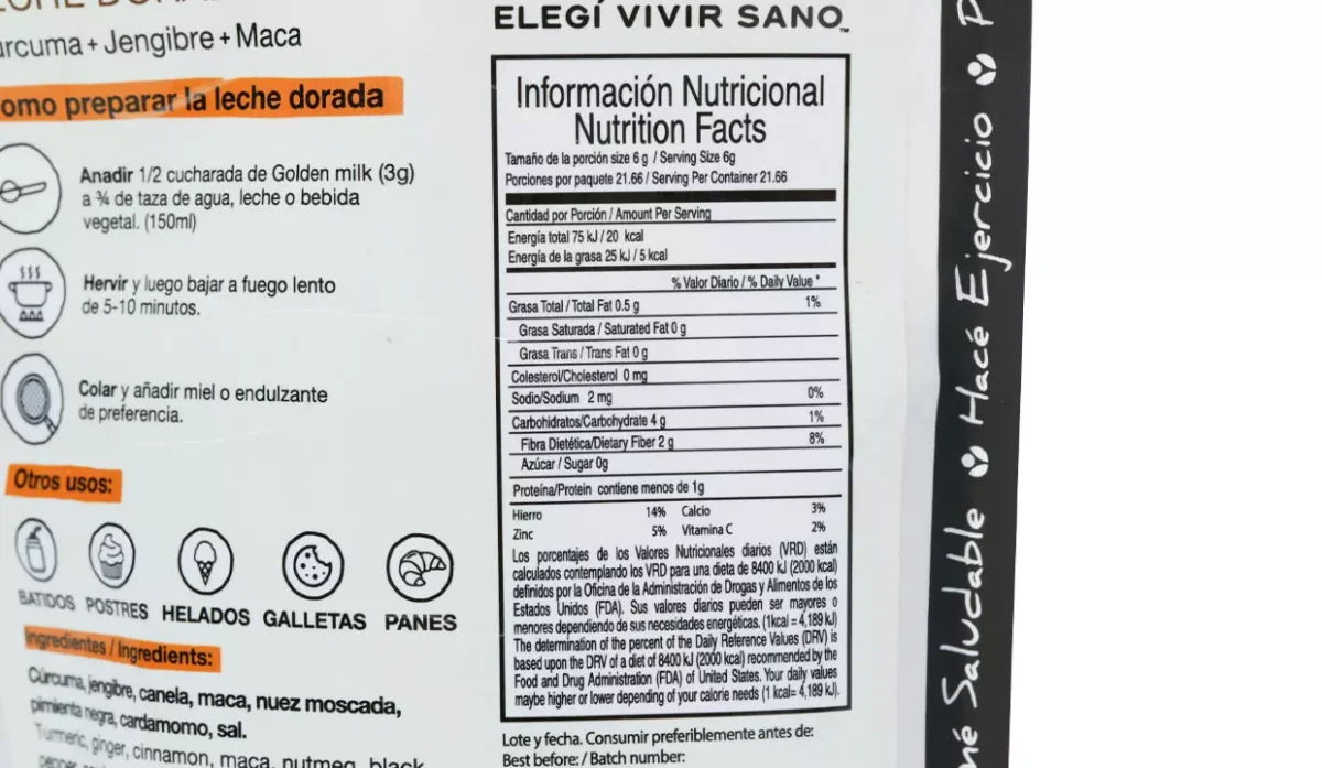 | Ingredientes | Cúrcuma, jengibre, canela, maca, nuez moscada, pimienta negra, cardamomo, sal |