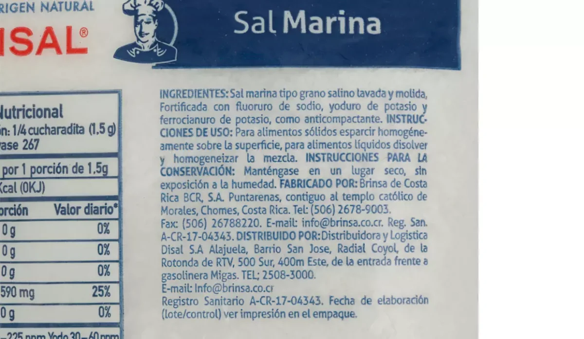| Ingredientes | Sal marina tipo grano salino lavada y molida, fortificada con fluoruro de sodio, yoduro de potasio y ferrocianuro de potasio, como anticompactante |
